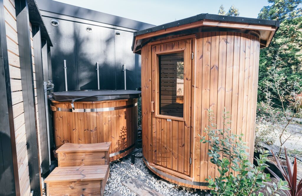 六角形のサウナ小屋が特徴的で、新鮮な外気を取り込む換気システムを採用しています。バレルサウナも完備されており、2種類のサウナを楽しむことができます。温度は80~90度に設定されており、じっくりと汗をかける環境です。