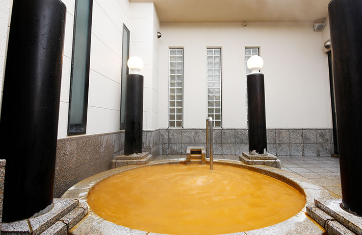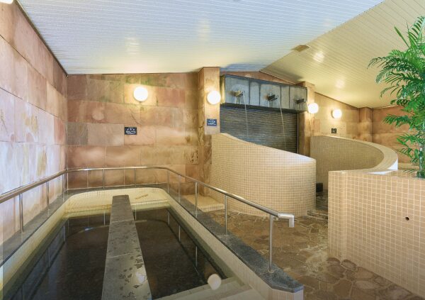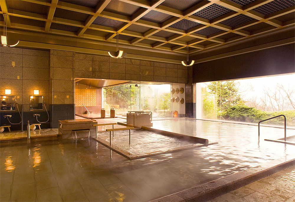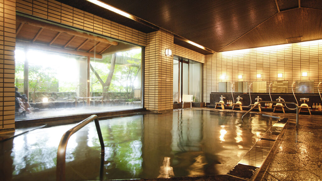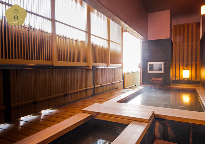 日本の四季を表現する花をテーマにした旅館。大浴場・露天風呂すべてで金泉を楽しめ、サウナも完備。7階には展望金泉貸切露天風呂「花ごころ」があり、45分2,200円から利用可能です。大理石仕立ての洗練された浴場で、上質な温泉体験が楽しめます。