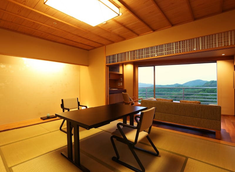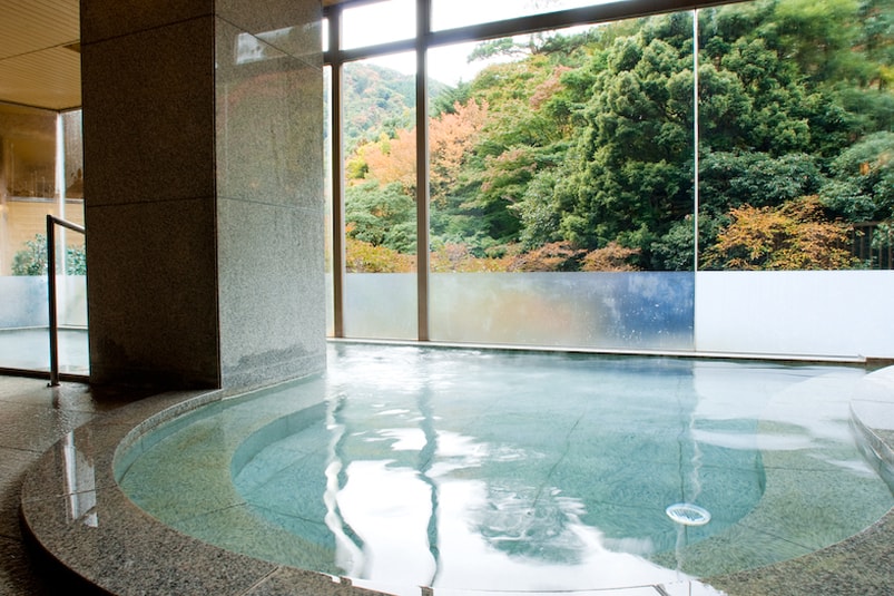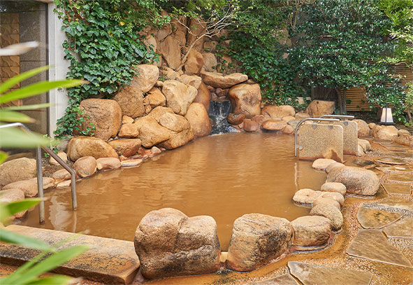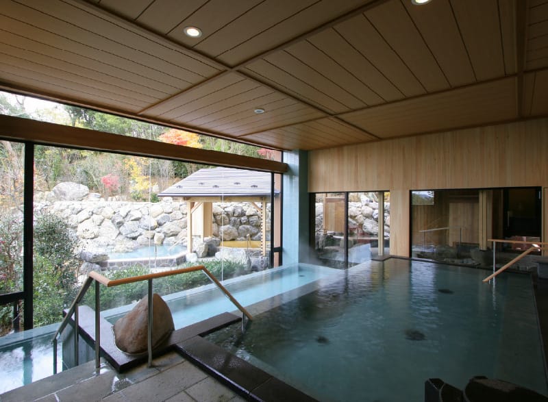 櫟(くぬぎ)林の中に佇む、自然豊かな湯宿。自家泉源の金泉とラジウム泉の銀泉を、森林浴と共に楽しめます。御影石造りの大浴場と丹波石造りの露天風呂に加え、低めの温度設定でゆっくり入れるサウナを完備。小窓から美しい緑を眺めながら、心身ともにリラックスできます。